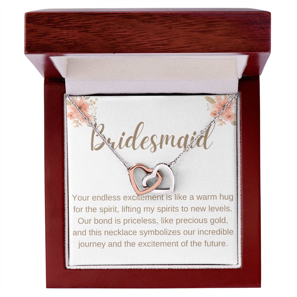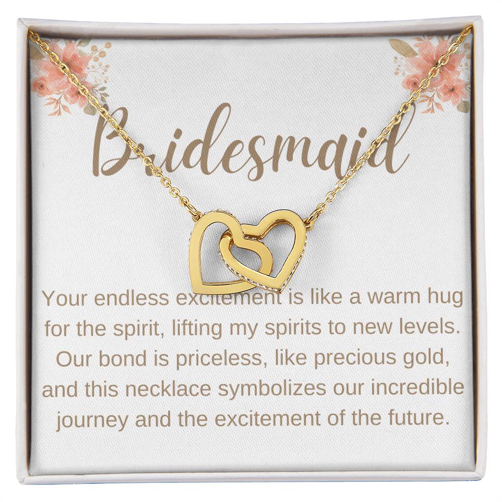 Impress your bridesmaid with the exquisite Bridesmaid heart to heart necklace. Shimmering cubic zirconia crystals decorate two interconnected hearts, creating an alluring accessory that is perfect for any occasion. Treat your bridesmaid to this elegant gift as a token of your appreciation.